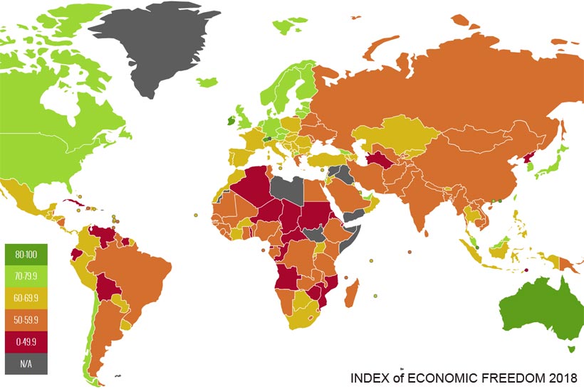 «Тепловая» карта Индекса экономической свободы-2018. Иллюстрация: heritage.org