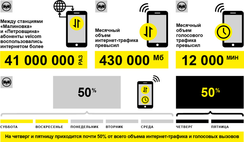 За два года с момента появления связи в тоннелях между станциями «Малиновка» и «Петровщина» абоненты velcom воспользовались мобильным интернетом более 41 млн раз.