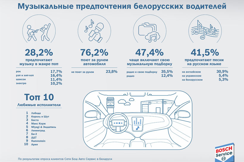 Около месяца «Бош Авто Сервис» опрашивала клиентов своей сети по всей Беларуси о том, какую музыку они предпочитают слушать за рулем. Каким оказался результат?