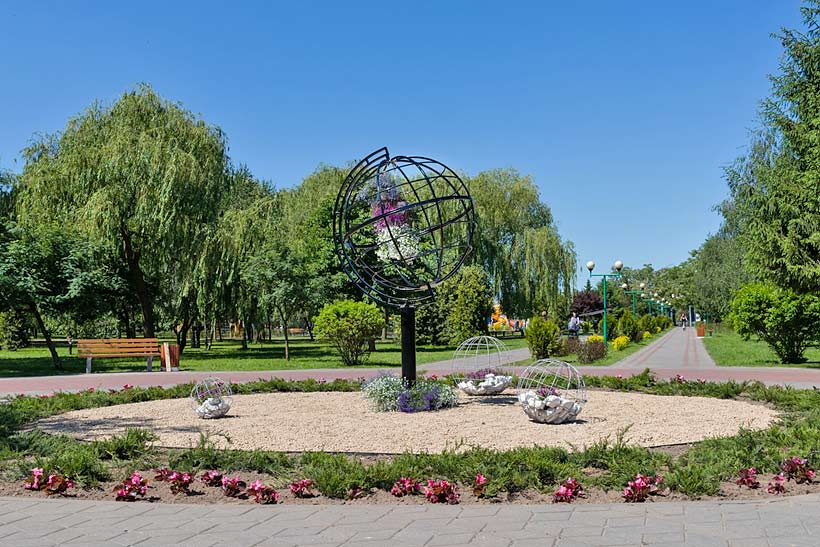 У входа в парк посетители смогут ознакомиться со схемой расположения объектов в парке. Центральная композиция – крупная скульптура земного шара – олицетворяет название парка.