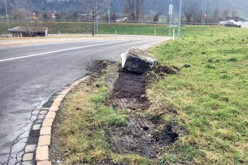 Выполняя маневр, транспортное средство задело боком два каменных блока и протащило их несколько метров. Ущерб был причинен как грузовику, так и придорожному элементу.