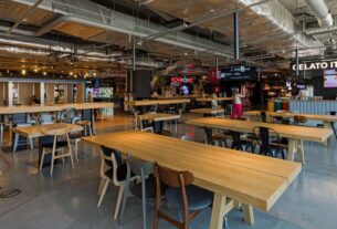 Торговый центр занимает два уровня. Первый выделен для небольших магазинов. Второй – под авторскую и уличную еду, где соберут более 20 гастро-концептов, рядом с открытыми кухнями расставят столы для гостей, а ближе к панорамным окнам устроят сцену с живой музыкой.